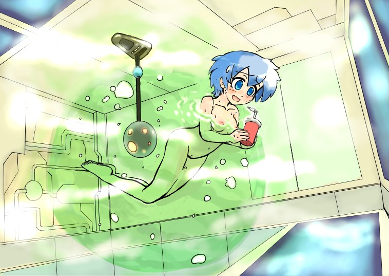 無重力の中で球状にまとめられたお湯の中はソラもお気に入りです。